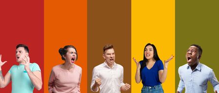 Portrait of group of emotional people on multicolored background. Flyer, collage made of 5 models. Concept of human emotions, facial expression, sales, ad. Angry screaming, shouting, disturbance.