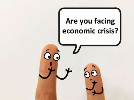 Two fingers are decorated as two person. One of them is asking another if he is facing economic crisis.