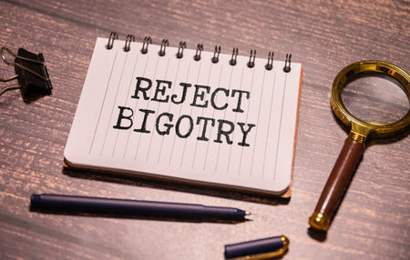 Text Prevent Bigotry written in blue under a wire mesh.
