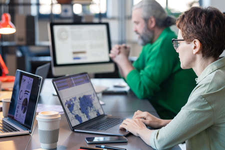 Rear view of businesswoman in eyeglasses sitting at the table and typing on laptop, she analyzing charts online with her colleagues in the background