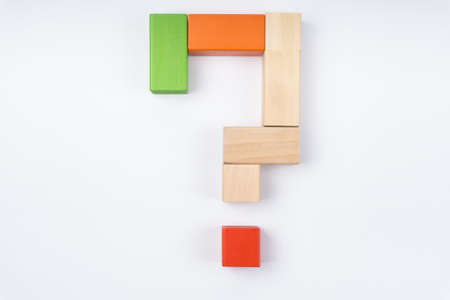 Wooden cube with question mark on white background. Concept for confusion, question or solution.