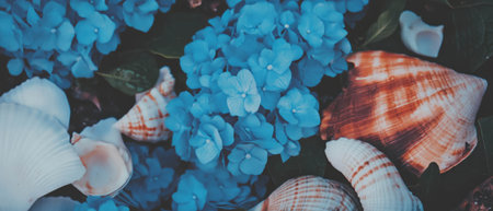 Blue hydrangeas and seashells create a serene beach-inspired flat lay arrangement
