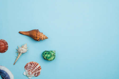 Beautiful seashells on light blue background, flat lay. summer vacation
