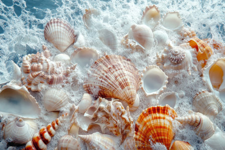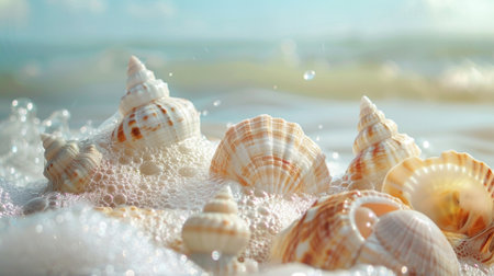 Beautiful seashells nestled in ocean foam on the beach, creating a serene and coastal scene with sunlight reflecting on the water.