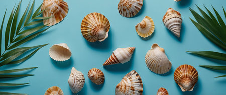 AI Generated. Minimalist sea shells and palm leaf on pastel blue background