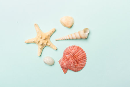 Elegant arrangement of colorful seashells on a soft pastel background, showcasing natural beauty