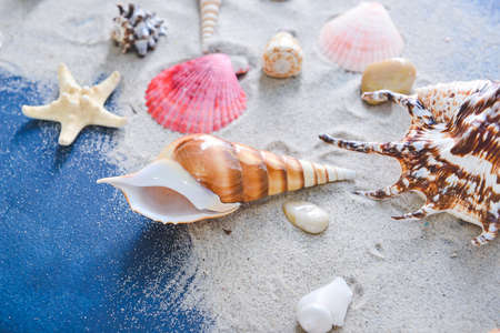 Colorful seashells on the beach at sunset time. Summer vacation concept