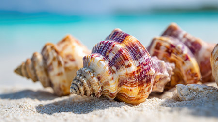 Three seashells of various sizes and intricate patterns are arranged on a sandy surface, with blurred turquoise water in the background. The shells display a range of colors, including brown, purple, and orange. The composition uses natural light and shallow depth of field, suitable for travel or nature themed applications.