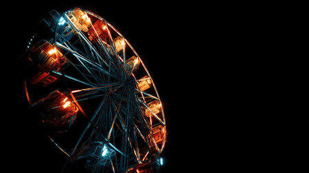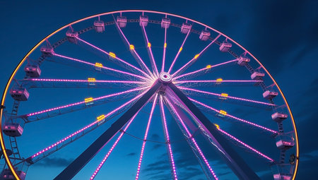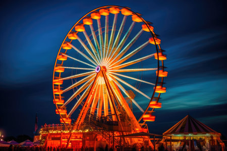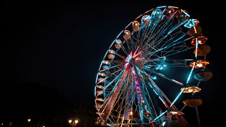 Colorful ferris wheel illuminated at night. Mesmerizing light trail effect at a lively carnival with vibrant attractions