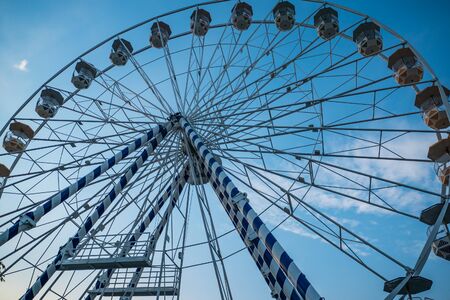 Ferris wheel for panoramic view in amusement park is popular entertaining ride in summer evening, selective focus