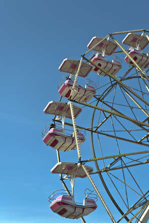 Ferris wheel on blue colorful sky background. Amusement park. Summer holidays and vacations.