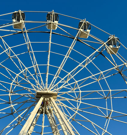 Abu Dhabi, United Arab Emirates - February 2022: Close-up details of ferris wheel on clear blue sky background, with metal beam guides and passenger booths. Marina Mall ferris wheel