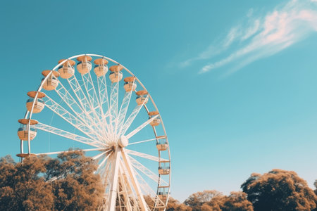 Retro brightly colored ferris wheel is silhouetted against a vibrant blue sky on a sunny day, with white clouds on background. Generative AI