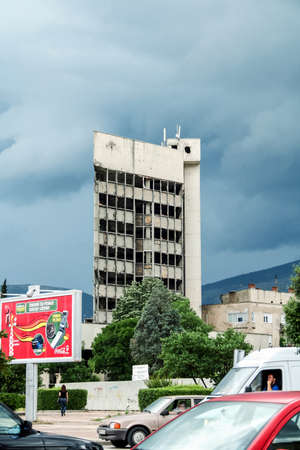 MOSTAR, BOSNIA - JUNE 6, 2008: Main facade of the damaged and bombed building of sniper tower in Mostar, destroyed during the 1991 1995 civil war conflict of Bosnia and herzegovina.