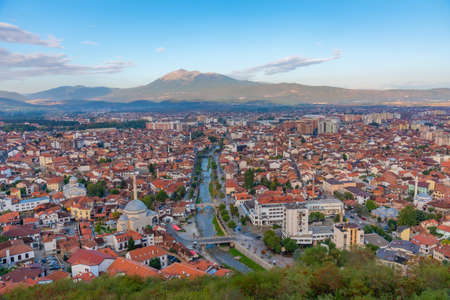 city scape of second bigest city Prizren in Kosovo at sunset with red roofed houses and mosques. In the background a mountain range.