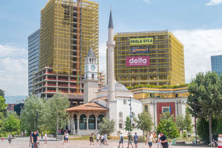 Tirana, Albania - June 4, 2022: Et'hem Bey Mosque, Clock Tower on Skanderbeg Square.