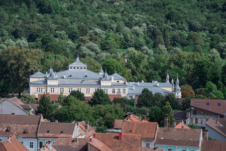 View from the stone walls at the Rupea Citadel (Cetatea Rupea) after renovation towards a small town in Brasov county, in the southern part of Transylvania (Transilvania) region, Romania in summer