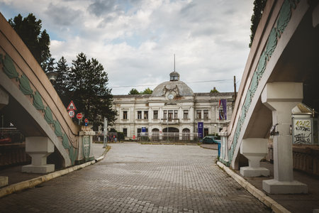 Campulung Muscel, Romania - June 20, 2020: Town hall or city hall in Campulung Muscel, Arges county, Romania. Beautiful architectural building located in the city center