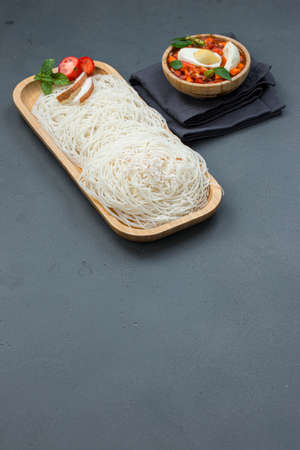 Ideyappam or noolappam,south Indian breakfast item made using raw rice which is arranged in a wooden serving base with egg masala as a good combination on grey textured background.