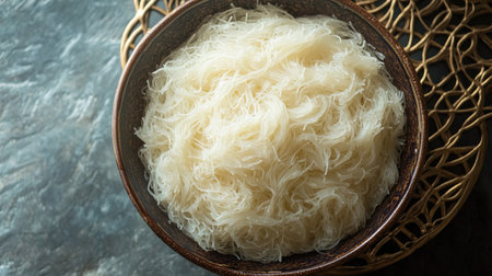 Top view of raw edible bird nest in a clear glass bowl, its fine fibers illuminated by soft natural light.