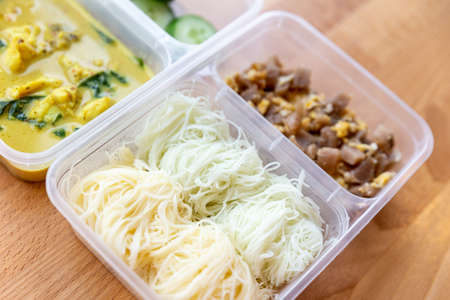 Chicken Curry Soup with Rice Vermicelli, Fried Eggs with Preserved Turnip and Cucumber in box meal.