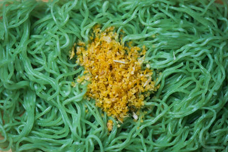 Green jade noodles with garlic in dish, blackground jade noodles