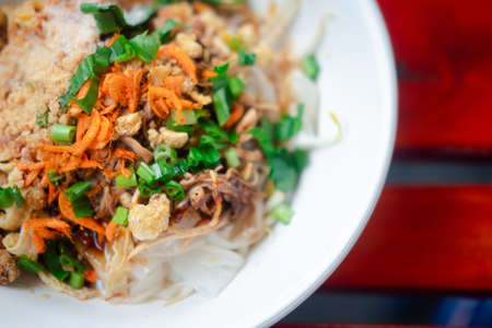 Ancient tube noodle, thai traditional local food, in thai call 'kuay-teaw-lord'. mixture varieties of ingredient that will mix together as a noodle