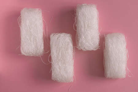 Asian uncooked cellophane noodles on a pink background top view flat lay pattern