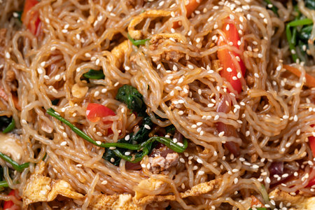 Japchae, Korean stir fried glass noodles with vegetables, pork, soy sauce and sesame oil and seed