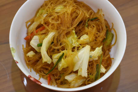 Fried Vermicelli in white dish on the wooden floor.