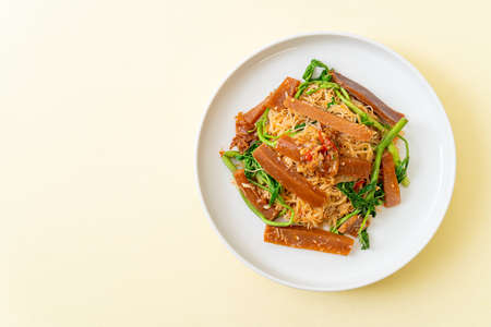 Stir-fried rice vermicelli and water mimosa with pickled squid - Asian food style