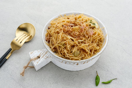 Bihun Goreng or Fried Rice Vermicelli, Traditional Indonesian culinary food. Served in white plate on grey background.