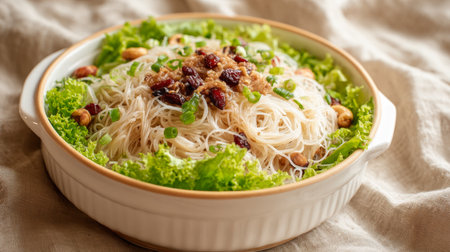 bowl of rice vermicelli noodles, artfully arranged with fresh green lettuce, toasted peanuts, and savory minced meat or mushroom toppings, garnished with chopped scallions and cranberries. Perfect for Asian cuisine, healthy eating, fresh food themes