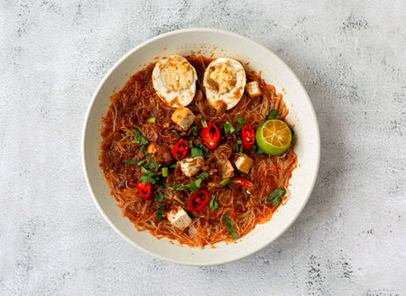 Burmese Mohinga Rice Noodle Fish Soup closeup in the bowl on the table. Horizontal top view from above