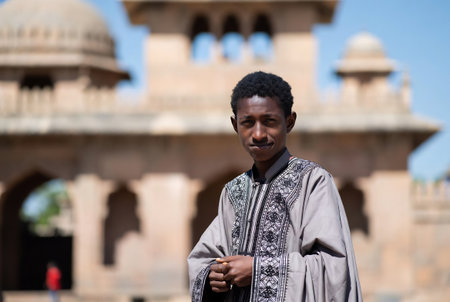 Bhopal, Madhya Pradesh,India - March 2019: An Indian man sitting on the steps of the ancient mosque of Taj Ul Masjid overlooking the old city of Bhopal.