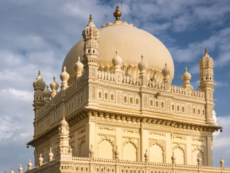 Mysore, India - October 26, 2013: Upper structure and dome of cream yellow Tipu Sultan mausoleum under blue cloudy sky. Golden Kalasam on top.