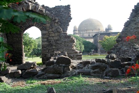 View of Gol Gumbaz behind ruins, Bijapur, Karnataka, India, Asia