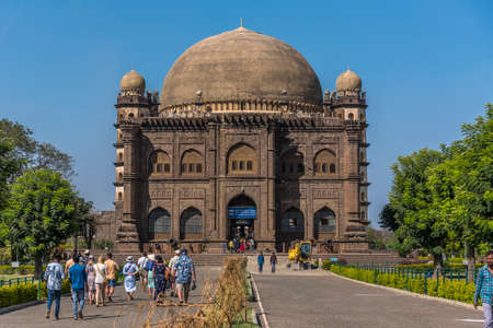 Vijaypura, India - February 15, 2019: Group of tourist walking towards the UNESCO World Heritage Site, Gol Gumbaz at Vijaypura, Karnataka, India.