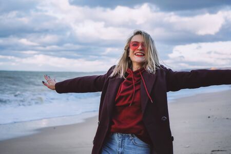 Portrait of pretty young woman posing on the Baltic sea beach in autumn