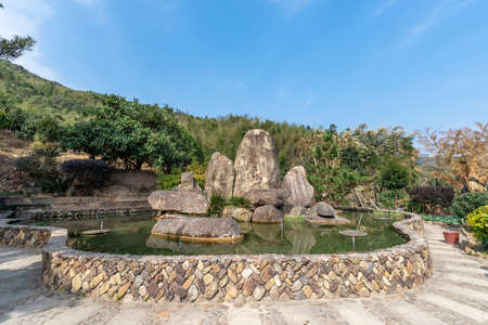 Japanese garden with pond and stone path in the middle of the forest