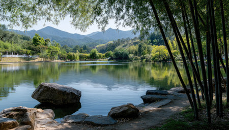 Landscape view of a lake in a park with bamboo trees.