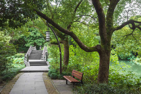 Footpath leading to bridge in park in West Lake scenic area in Hangzhou, China