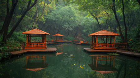 This beautiful stock photo showcases traditional pavilions by a calm lake, surrounded by lush greenery, providing a perfect escape into nature's tranquility.