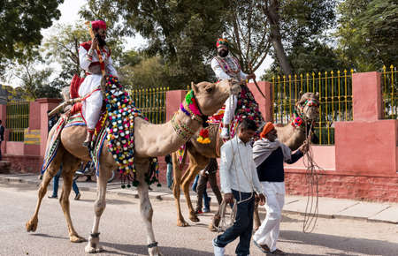 BIKANER, INDIA - JANUARY 12, 2019: Indian warriors riding on camel during festival in Rajasthan. The Camel Festival begins with a colourful procession of bedecked camels.