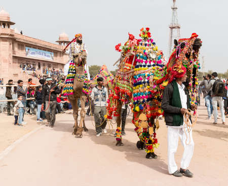 BIKANER, INDIA - JANUARY 12, 2019: Camel band performing at festival. The Camel Festival begins with a colourful procession of bedecked camels against the rugged backdrop of the Junagarh fort.