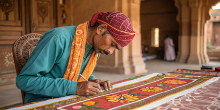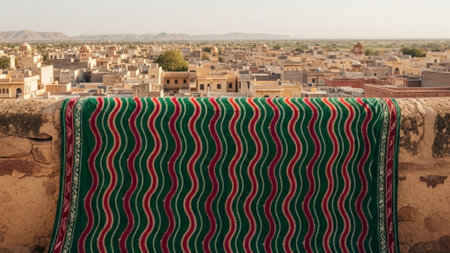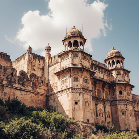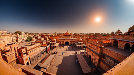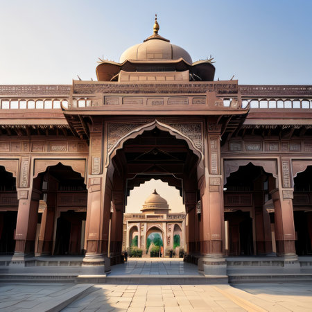 Experience the stunning beauty of traditional Indian architecture characterized by vibrant colors, intricate designs, and lush greenery, perfect for travel themes.