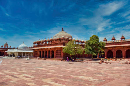 Agra, India - April 10,2014: Fatehpur Sikri a small city in northern India in the west of Agra, founded by Mughal emperor. Red sandstone buildings cluster at its center. Buland Darwaza gate is the entrance to Jama Masjid mosque.