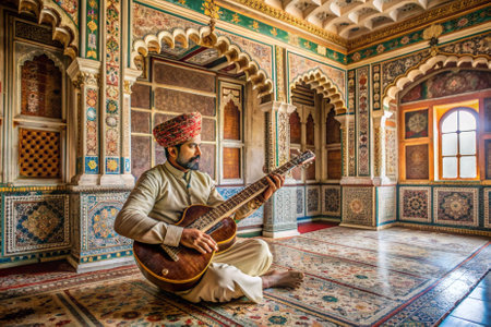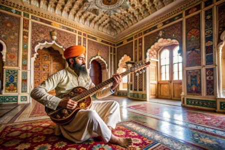 A man in a white robe sits on a rug playing a guitar. The room is decorated with colorful tiles and has a warm, inviting atmosphere