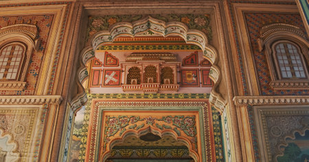 Jaipur, Rajasthan, India. Patrika Gate at Jawahar Circle. Interior inside, many Colorful ornament patterns on old walls. old Pink city