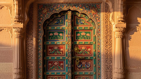 A beautifully decorated, arched wooden door in India, bathed in warm sunlight, featuring vibrant hand-painted floral motifs and detailed carvings.